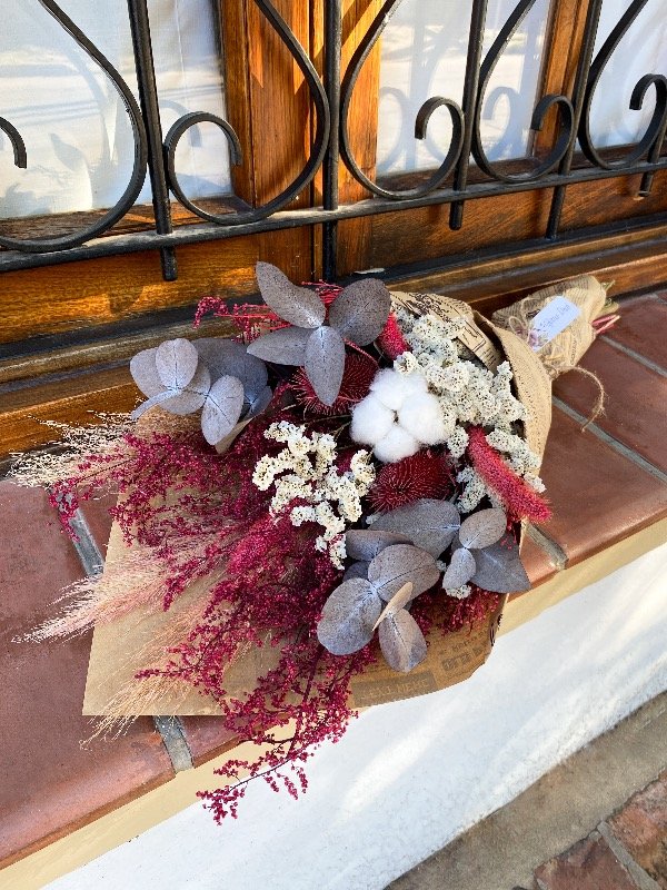Ramo con flor de algodon, eucalipto preservado y flores color bordo. Hermoso para regalar